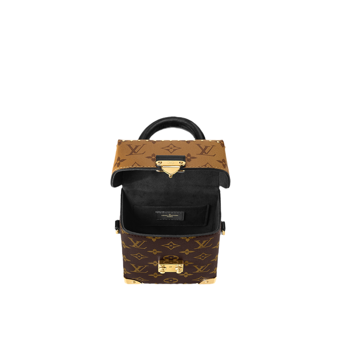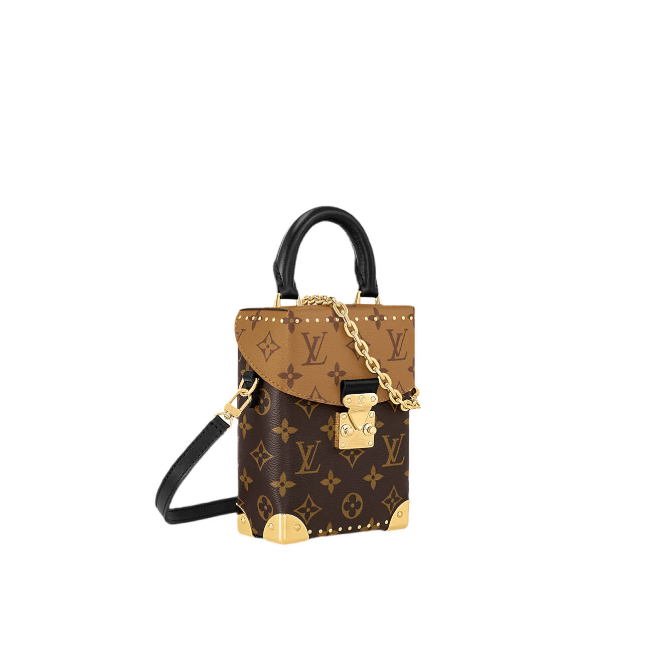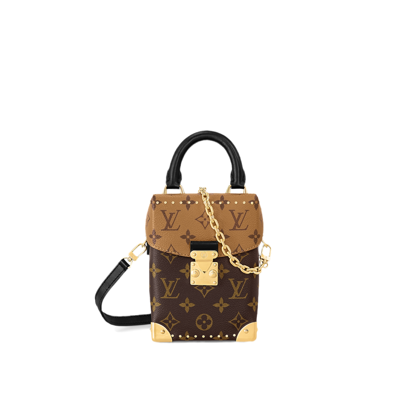 The Camera Box handbag combines all the Petite Malle’s signature details – S-lock, metallic corners, rivets, and a mix of Monogram and Monogram Reverse are all here – but on a modern shape. A thin gold-color chain brings a feminine touch to the bag while the pivoting top-handle adds a comfortable carry option.