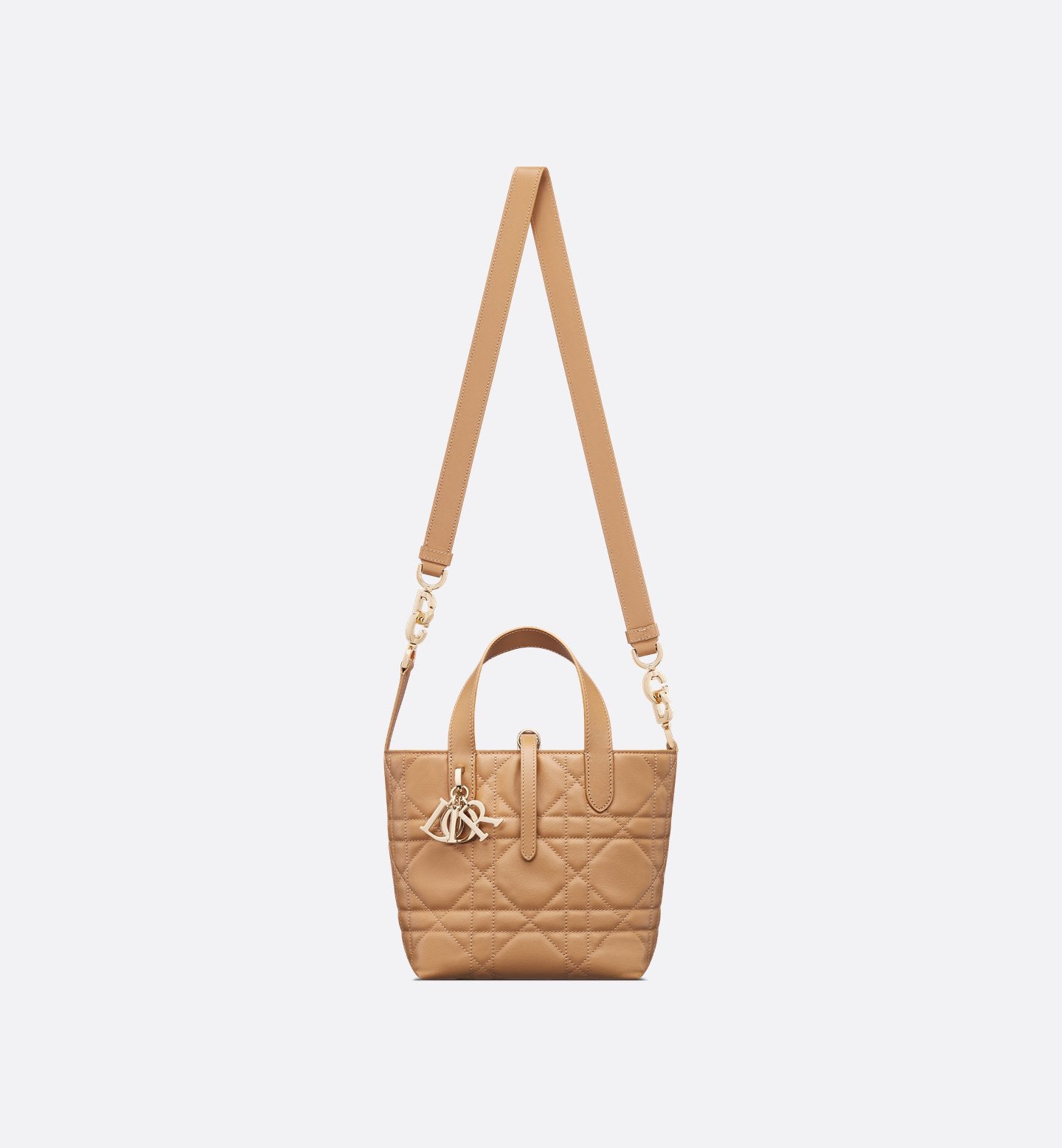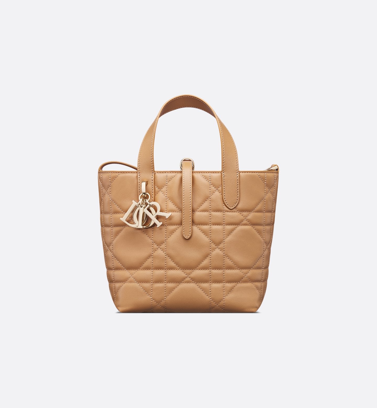 This Dior Toujours vertical tote is a practical creation with modern appeal. Crafted from medium tan calfskin with Macrocannage topstitching, it features a roomy interior compartment to organize your essentials. A slim leather strap closure keeps your essentials secure, while the D of the CD Lock clasp can be twisted to adjust the sides and change the shape of the bag. The leather top handles are finished with a removable leather strap, allowing you to carry this small accessory by hand, on the shoulder or crossbody.