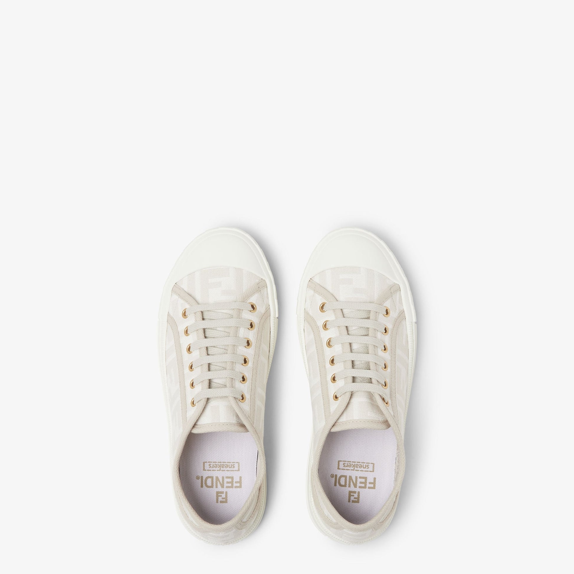 Domino sneakers with rubber cupsoles. Made of jacquard fabric with FF motif in ivory white. Trimmed with tone on tone grosgrain ribbon. The white sole with contrasting bottom features a combination of embossed textures, the FF pattern superimposed on the toe and the Fendi Roma logo on the heel. Extra white laces.