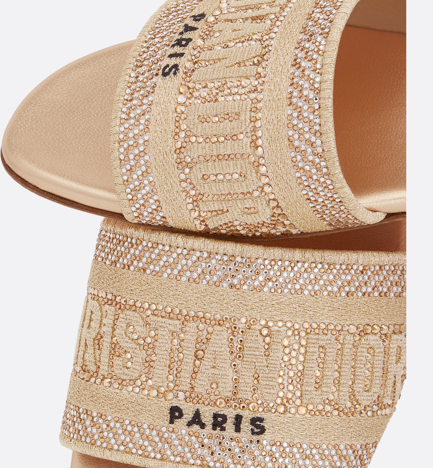 The hallmark Dway slide is a timeless creation. The design is offered in an elegant variation composed of cotton embroidered with metallic thread further adorned with gold-tone strass. The embroidered upper features a Christian Dior Paris signature that instantly stands out. Completed by a tonal laminated goatskin insole, the slide will lend a touch of refinement to any outfit.