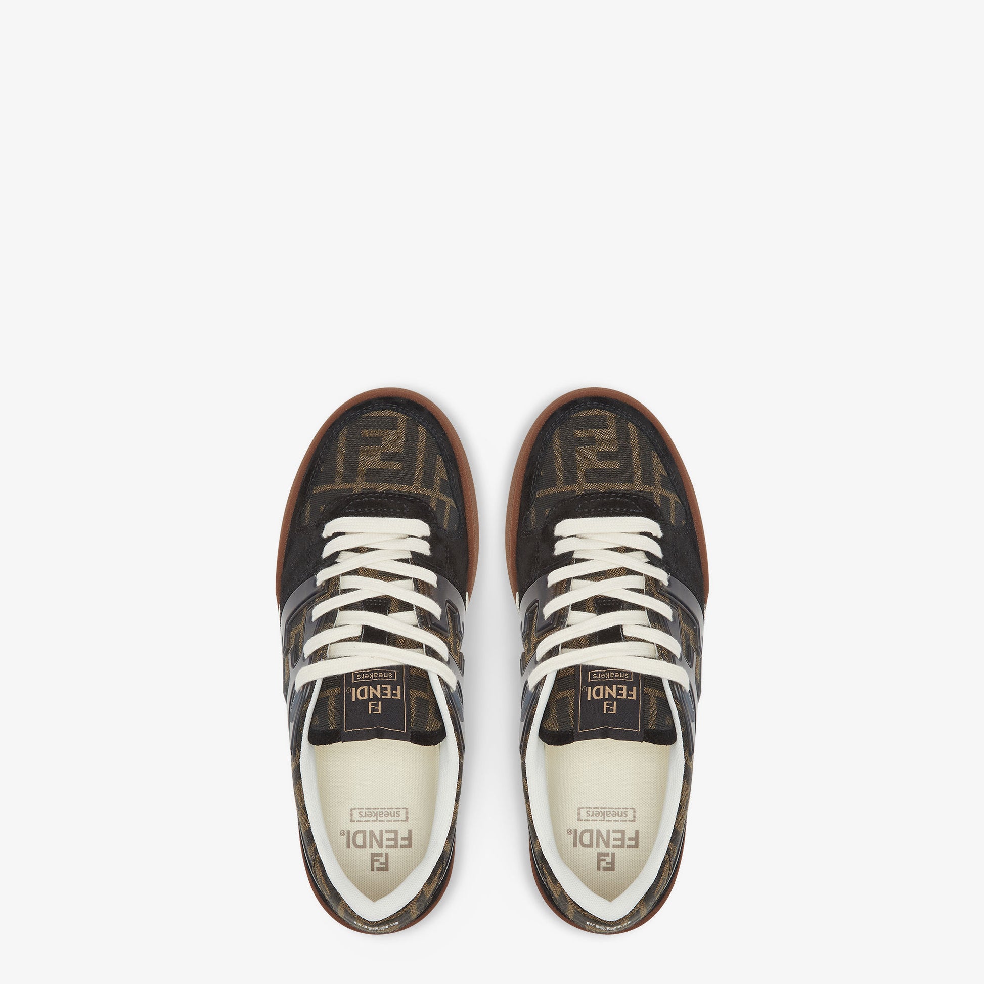 Fendi Match lace-up sneakers. Made of black suede with brown and tobacco jacquard FF fabric details and part of the collection curated with designer Stefano Pilati. Injection-moulded FF appliqué. Rubber sole with Fendi lettering on the side.