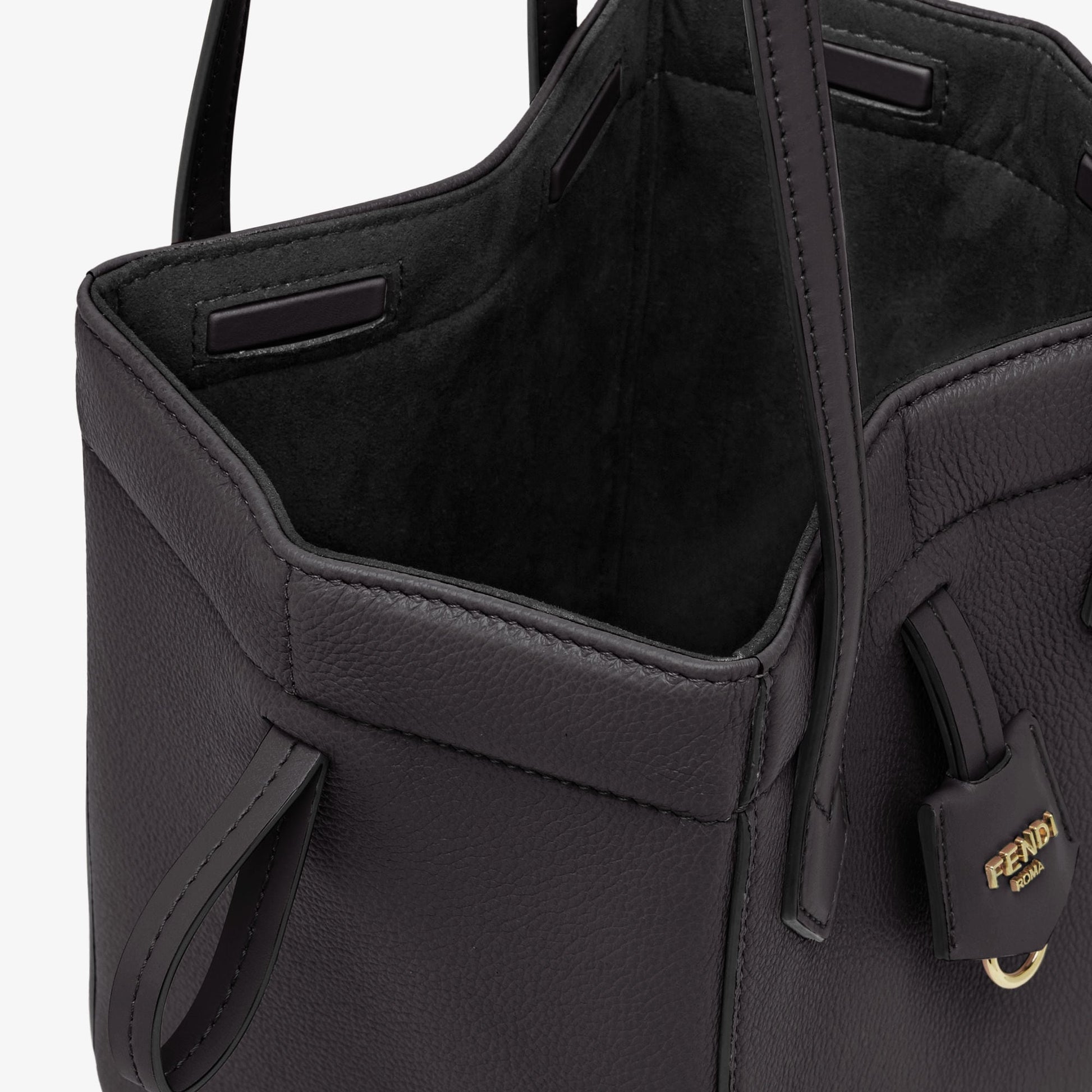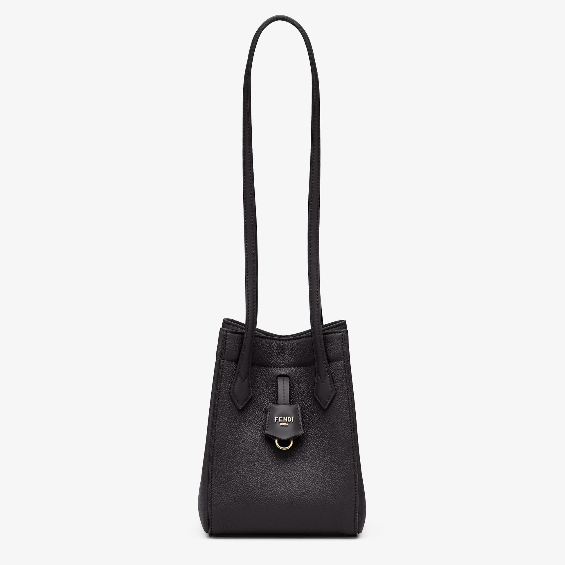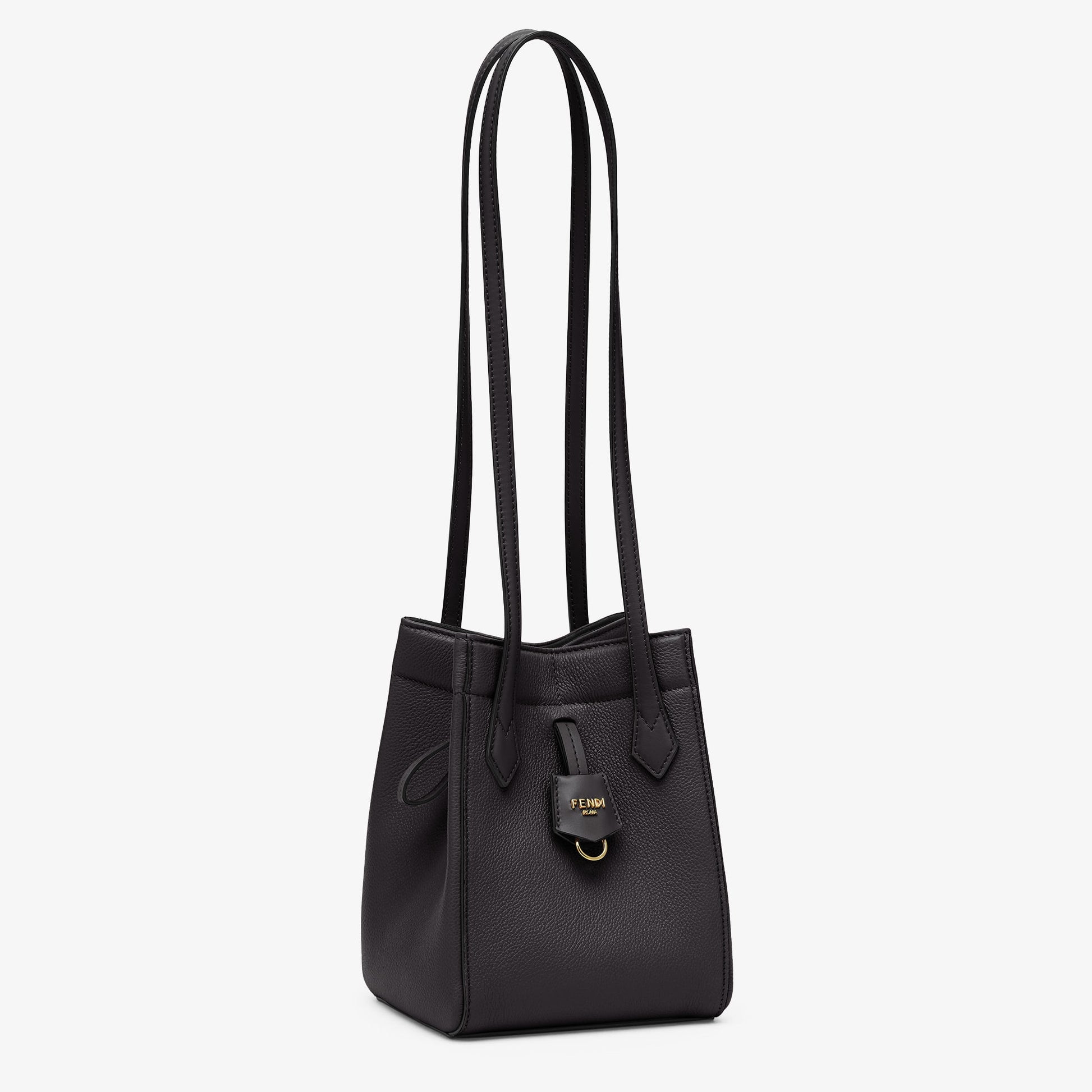 Mini Origami bag made of black full-grain leather. The style recalls the dual nature and creativity of Fendi with an innovative design that can be transformed: the ingenious closure with eight magnets means the bag can be folded, origami-style, transforming it from a bucket bag – when the magnets come together in the middle with a magic clasp – into a shopper by gently pulling the short shoulder straps on each side.