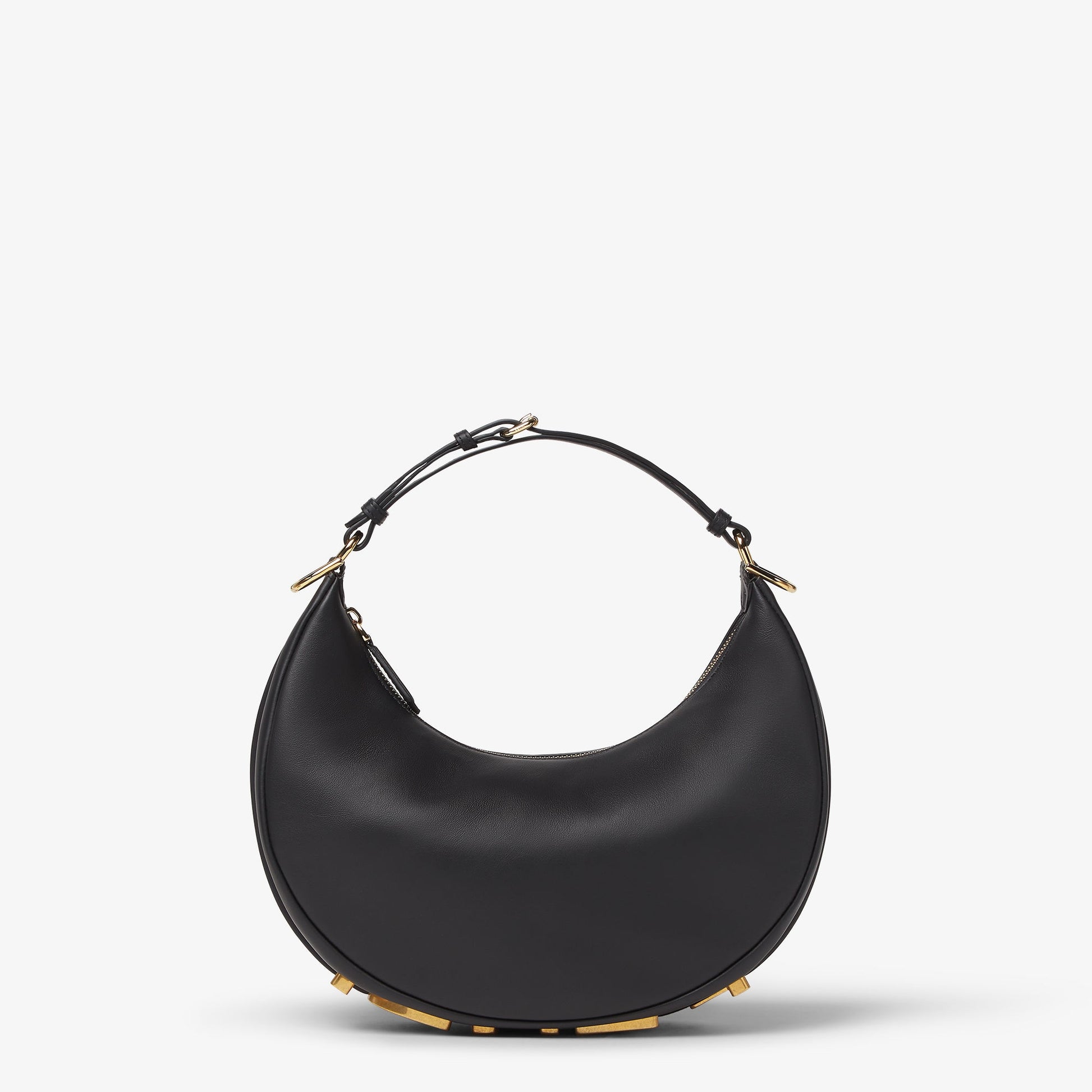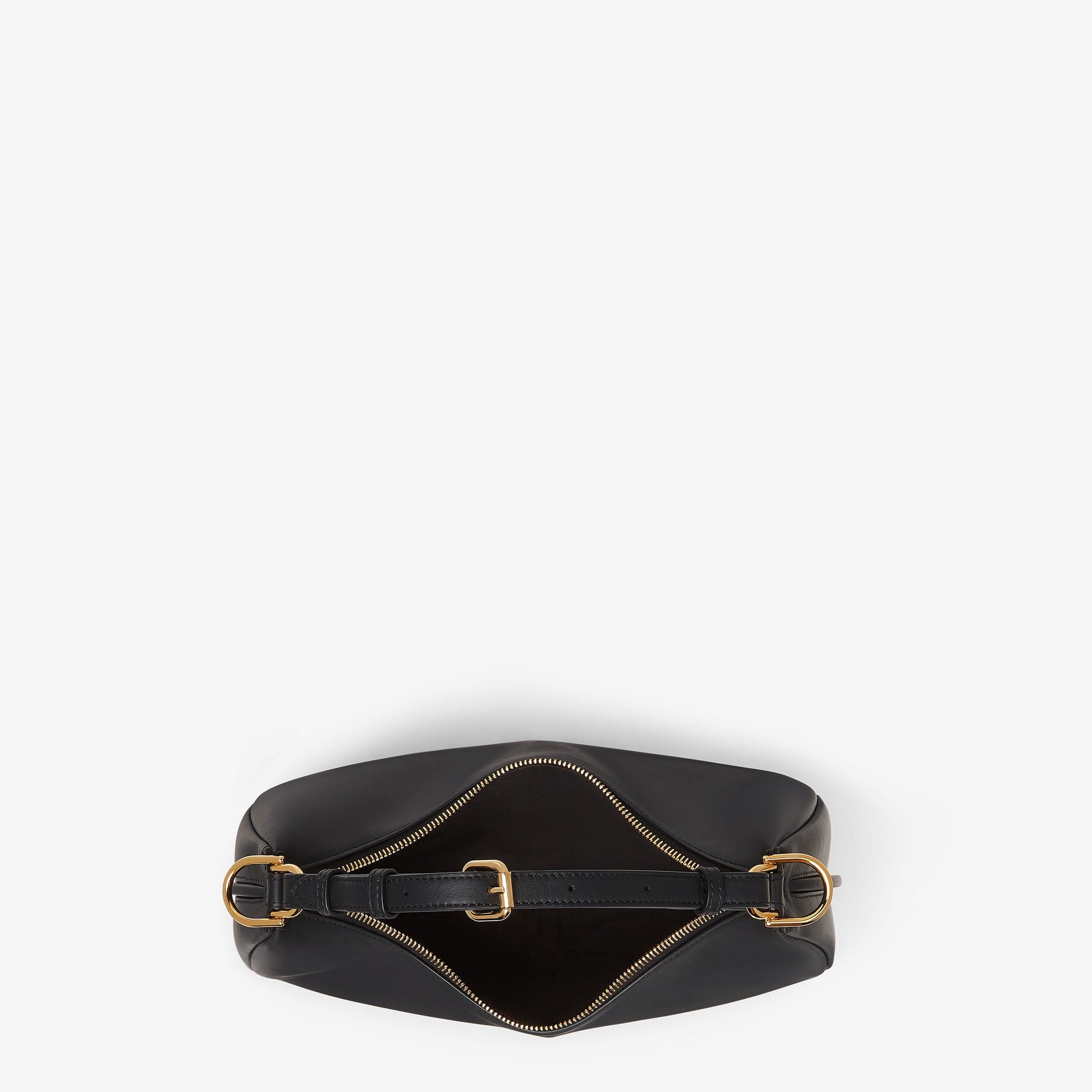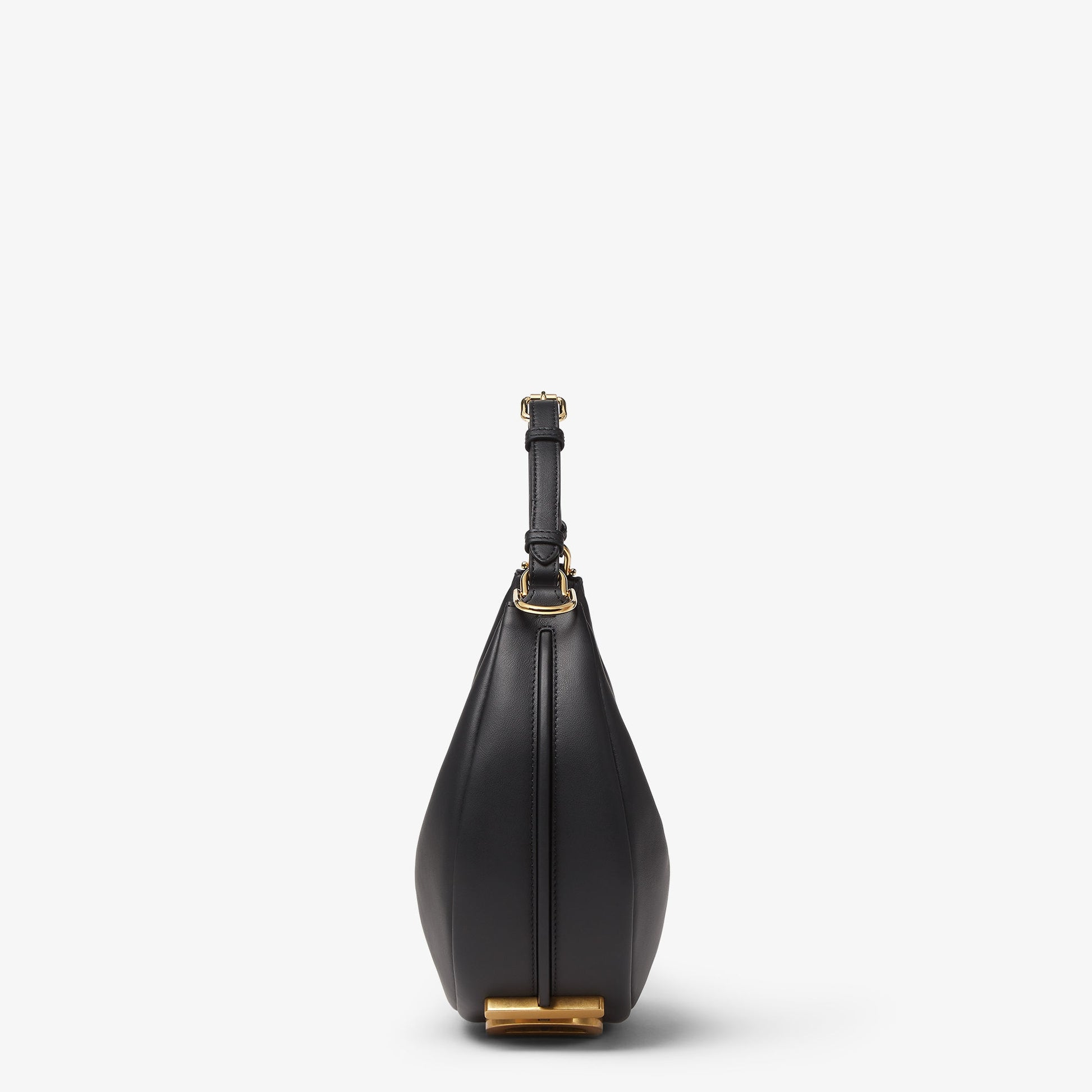 Small hobo bag made of soft black leather, with vintage gold metal FENDI lettering visible when the bag is worn under the arm.
