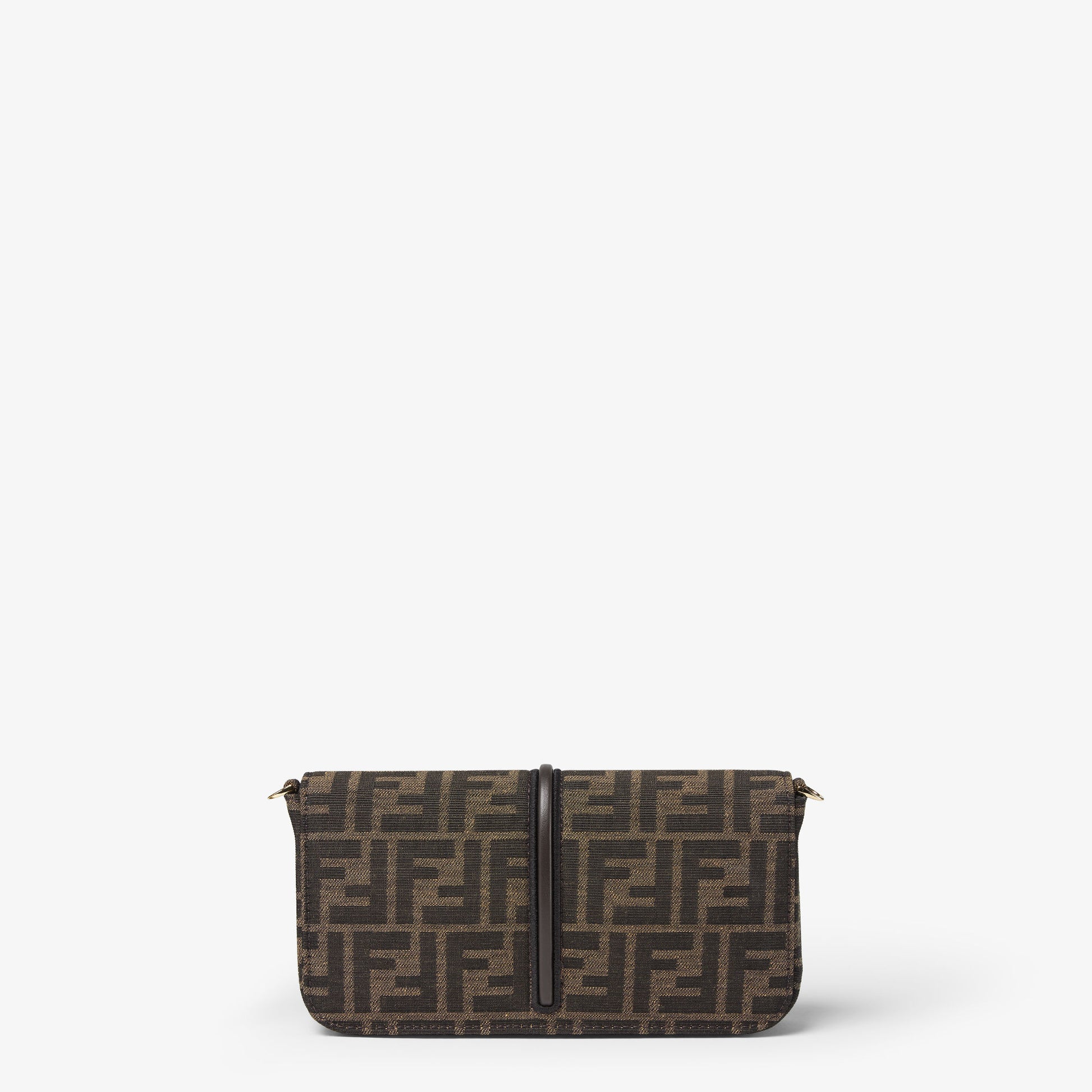 Compact Fendigraphy wallet with flap and metal Fendi lettering. Featuring an internal, removable pouch with eight card slots and zip pocket. Thin, detachable chain shoulder strap. Made of brown FF jacquard fabric. Gold-finish metalware.
