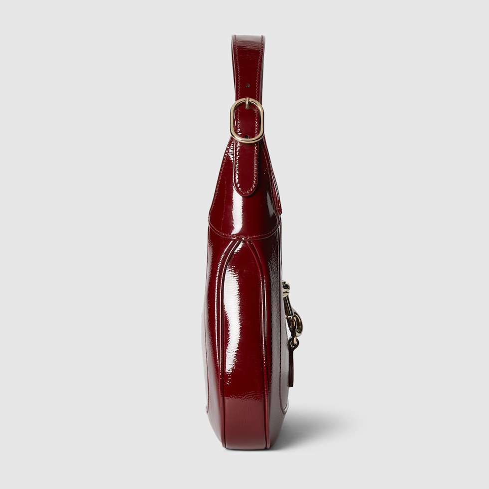 The new Gucci Jackie is crafted from fine leather which highlights the craftsmanship, crescent shape, and sleek silhouette of the House's iconic shoulder bag. Light gold-toned hook closure, leather trim, and an additional strap featuring the green and red Web gives this Gucci Jackie medium shoulder bag in Gucci Rosso Ancora leather, the signature red hue of the House, further styling options.