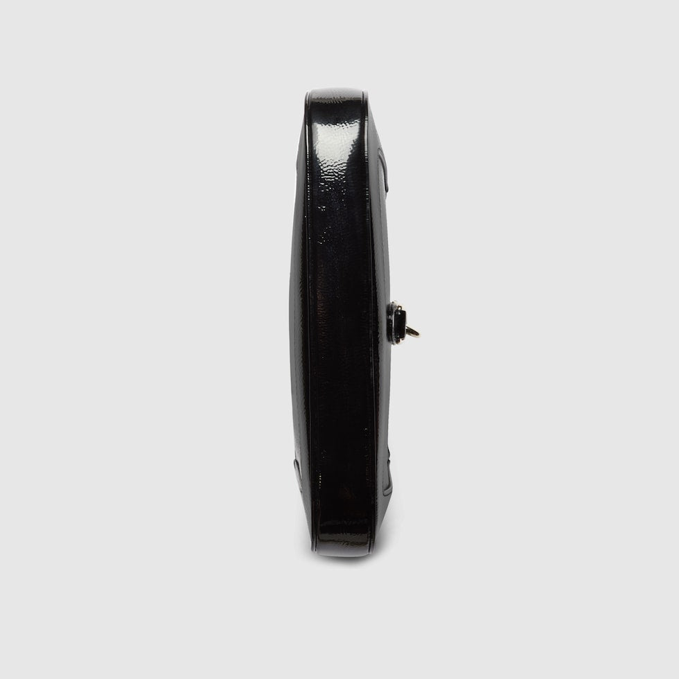 The new Gucci Jackie is crafted from fine leather which highlights the craftsmanship, crescent shape, and sleek silhouette of the House's iconic shoulder bag. Light gold-toned hook closure, leather trim, and an additional strap featuring the green and red Web gives this Gucci Jackie medium shoulder bag in black patent leather further styling options.