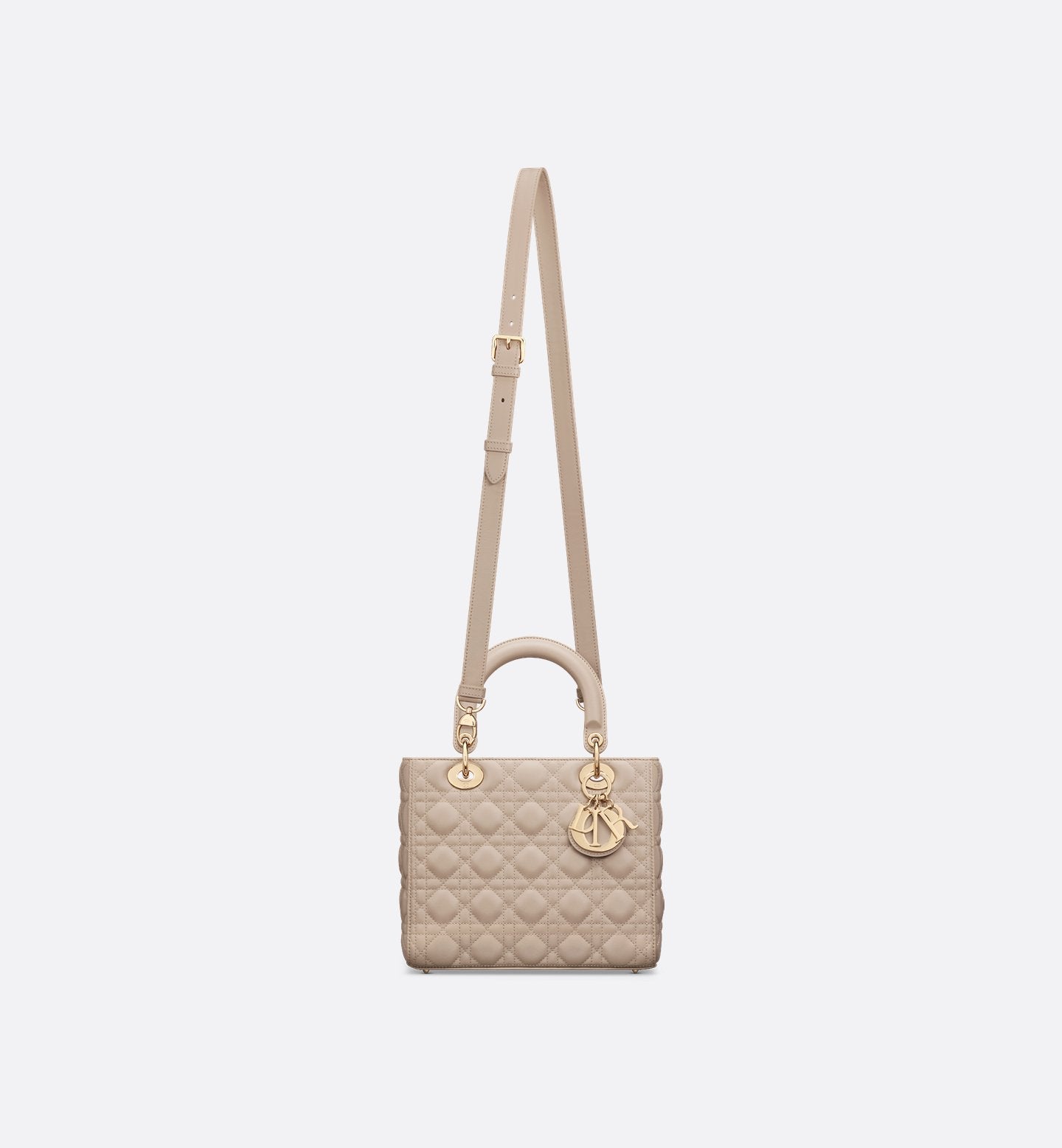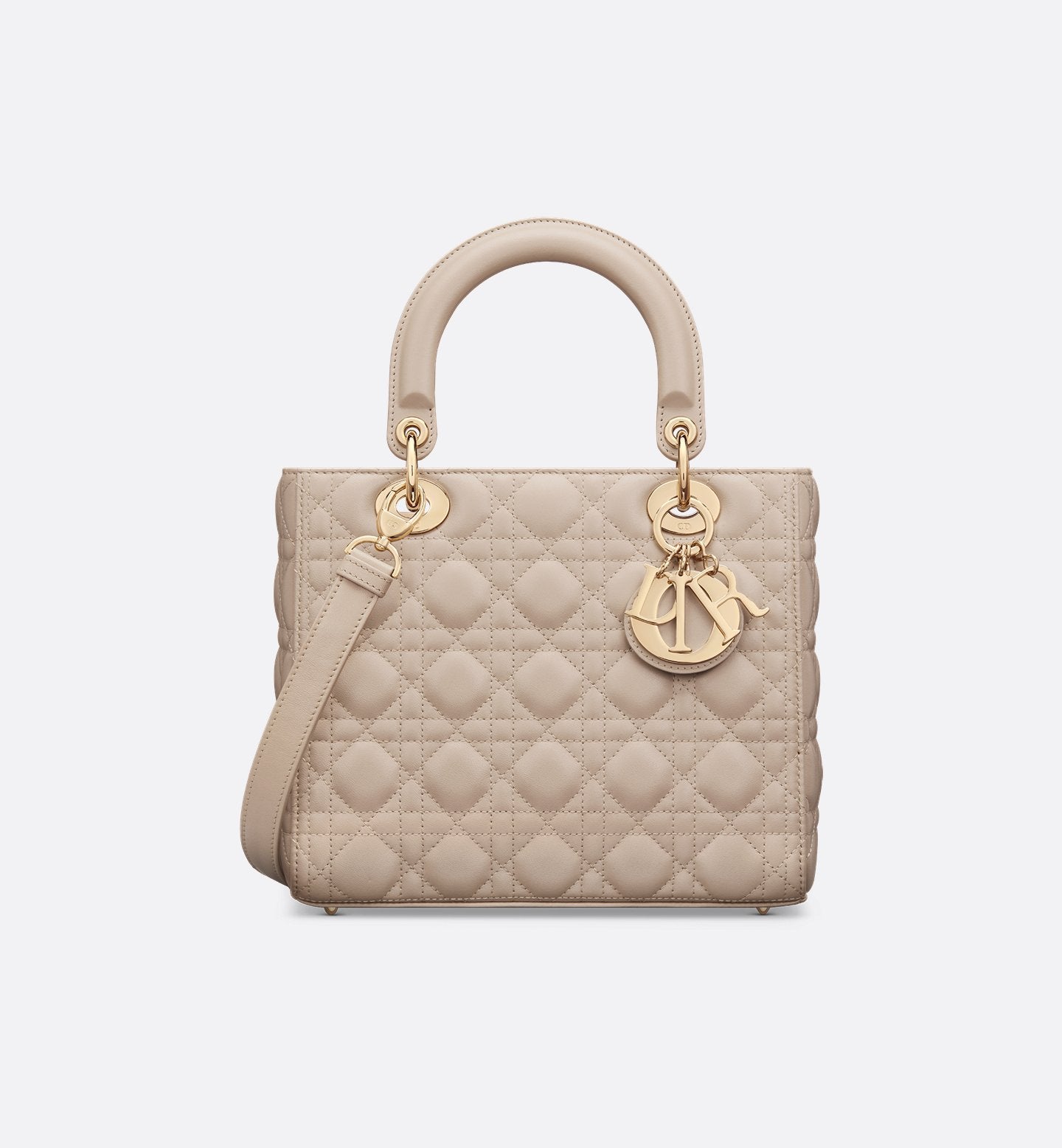 The Lady Dior bag is the quintessence of the Maison's refined style. Elegant and sophisticated, this version strikes with its timeless charm. Crafted from sand-colored lambskin, it is decorated with Cannage stitching that recreates the unmistakable quilted pattern. It is embellished with DIOR charms in pale gold-finish metal. Characterized by its medium size and equipped with a thin removable leather shoulder strap, it can be carried by hand or crossbody.