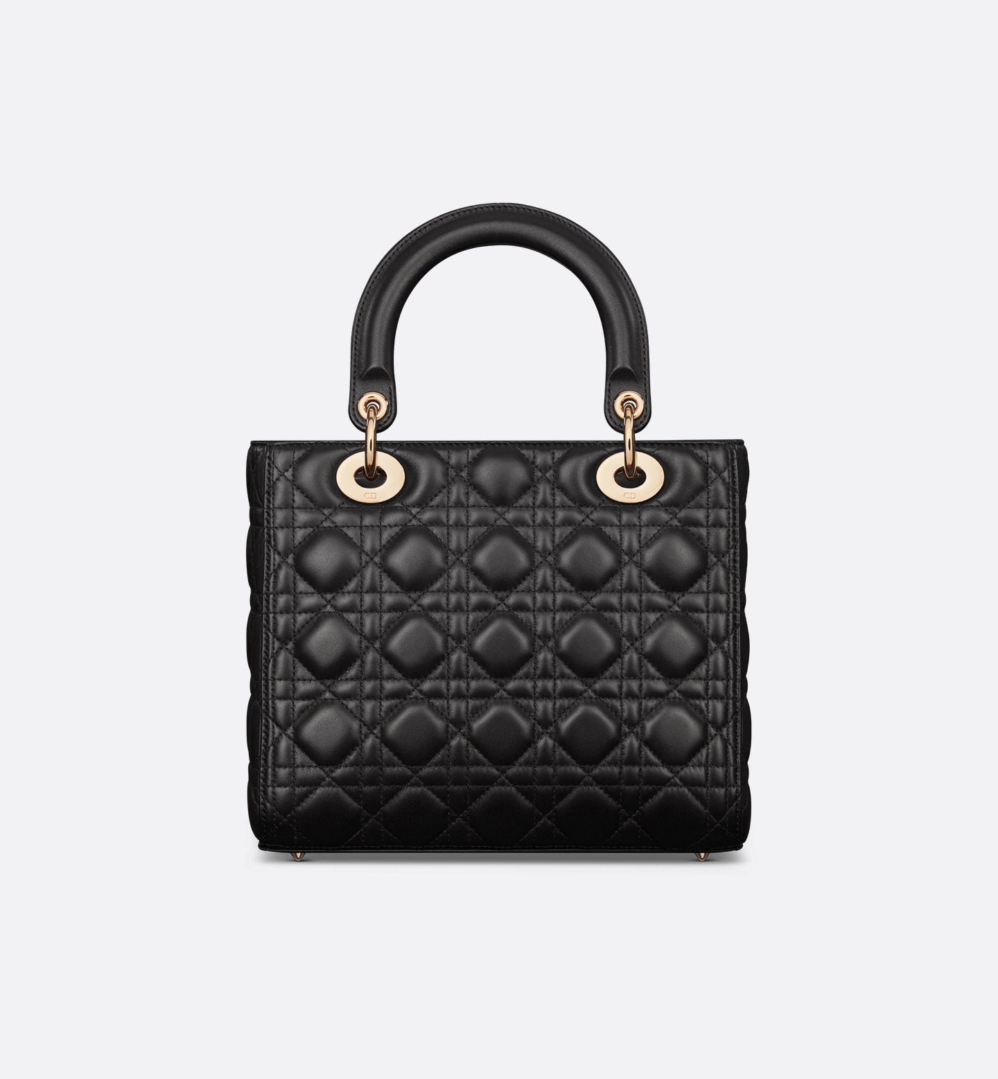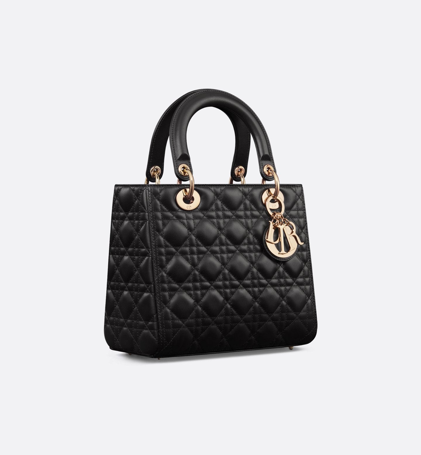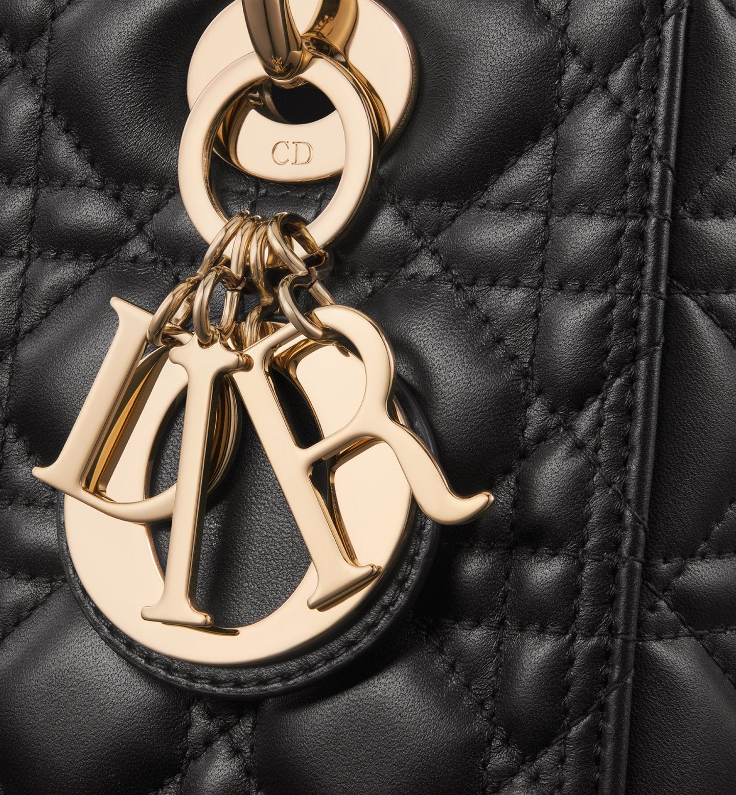 This Lady Dior bag is the epitome of the Maison's refined style. Elegant and sophisticated with a timeless allure, this version is crafted from black lambskin with Cannage stitching that recreates the iconic quilted texture. It is also embellished with DIOR charms in pale gold-finish metal, giving it an elegant touch. Featuring a medium size and a thin removable leather shoulder strap, it can be carried by hand or crossbody.