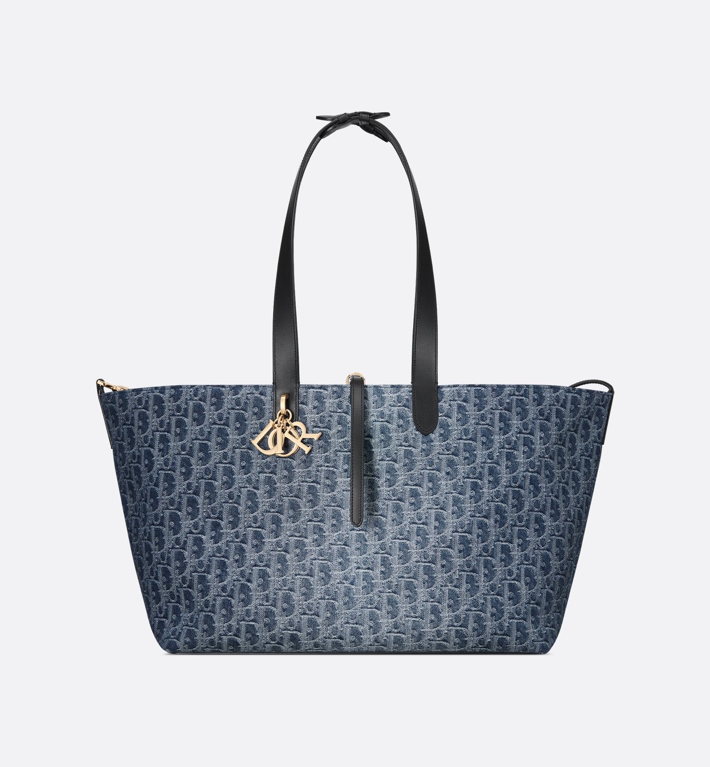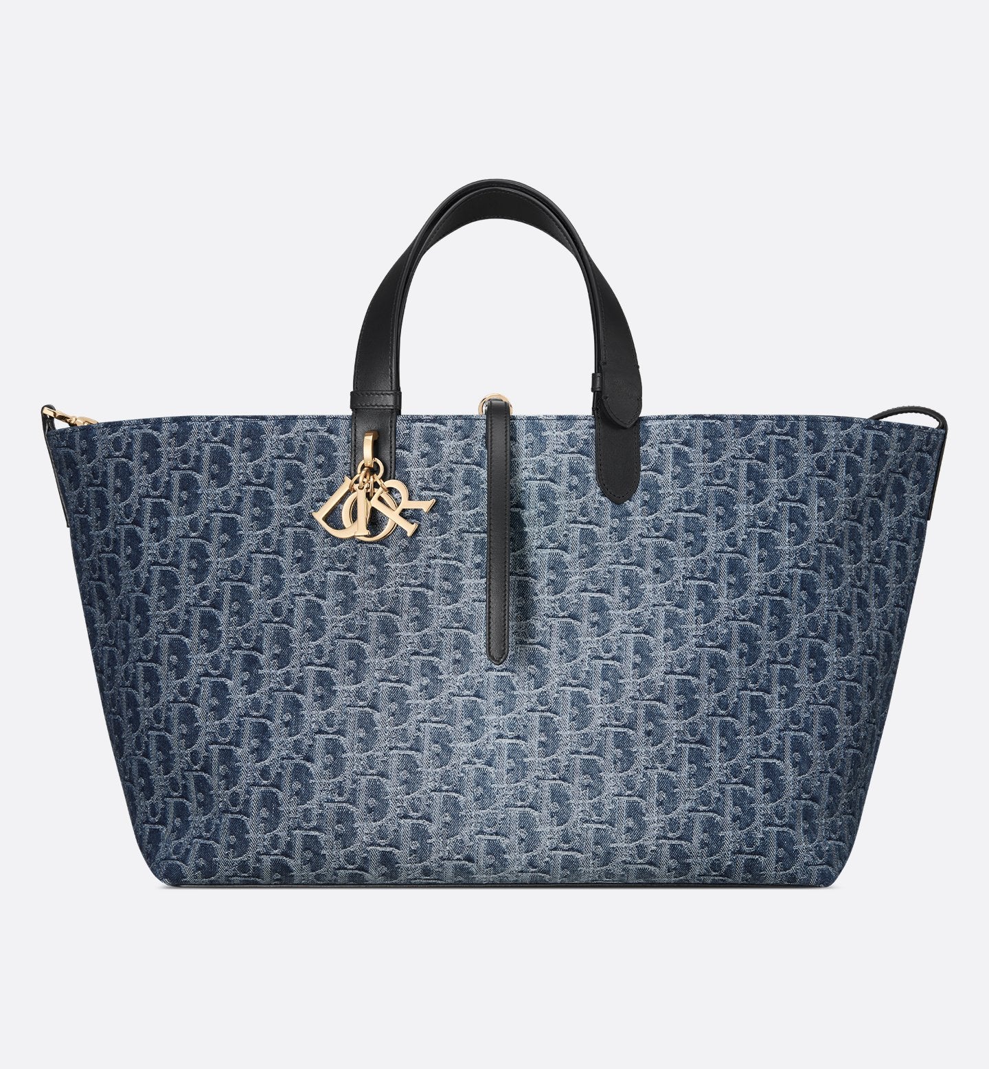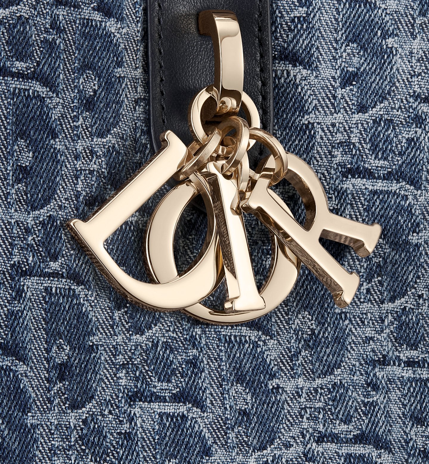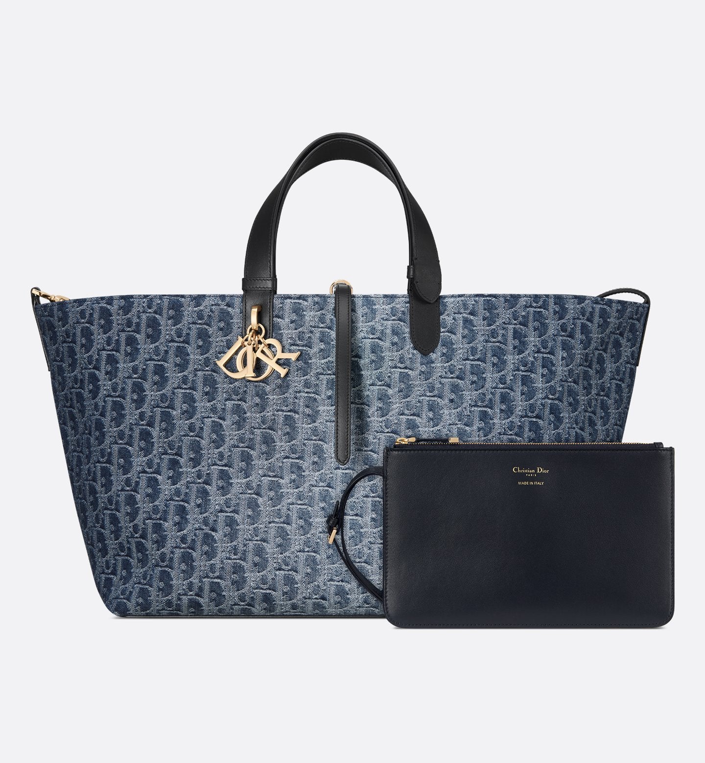 The Dior Toujours bag is distinguished by a casual and practical design. Crafted in blue Denim Dior Oblique jacquard, revisiting the House's iconic motif in a modern, irregular stonewashed effect, the model showcases a spacious interior compartment with a matching pouch to organize the essentials. Its thin leather strap closure keeps items secure while the D of the CD Lock clasp twists to alter the sides and enhance the bag's silhouette. The leather top handles can be adjusted using the small notches so the large bag can be carried by hand or worn over the shoulder.