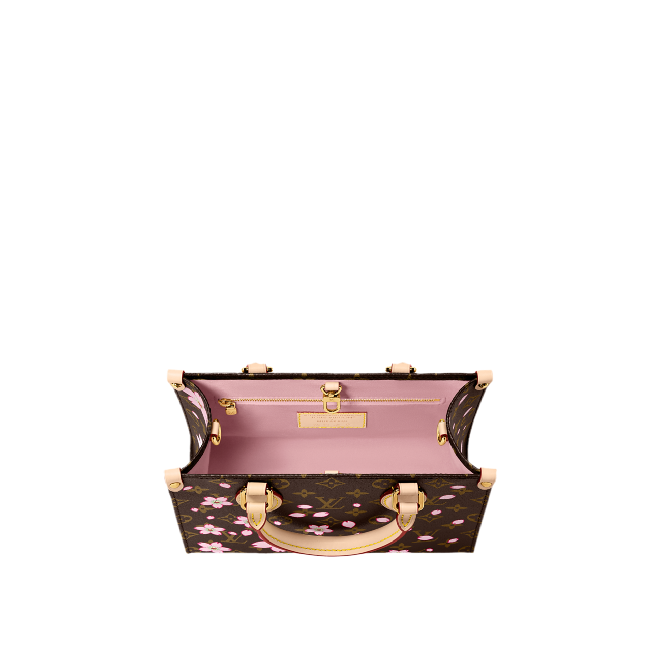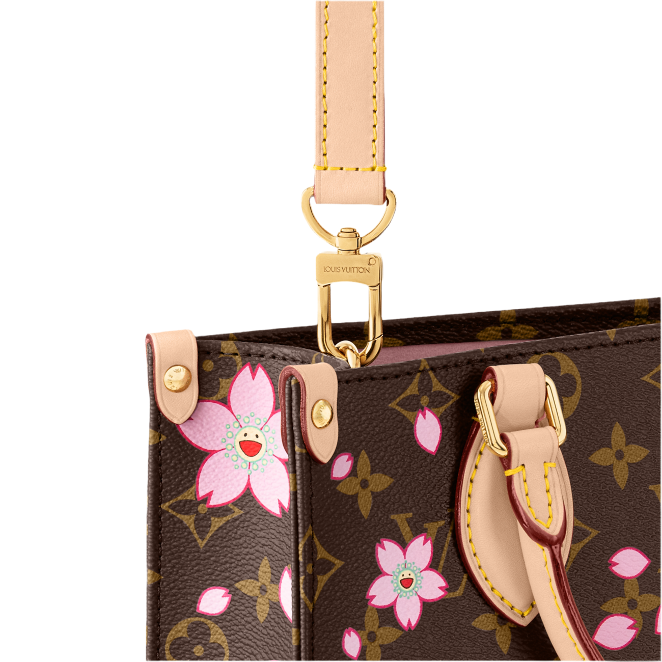The OnTheGo PM LV x TM bag is crafted from the iconic Monogram canvas, with natural cowhide trim and gold-tone metal details. The version offered is embellished with the removable charm and the signature printed motif of the new Louis Vuitton x Murakami Collection. The vibrant decorations, signed by the Japanese artist, represent cherry blossoms, a symbol of renewal and rebirth.