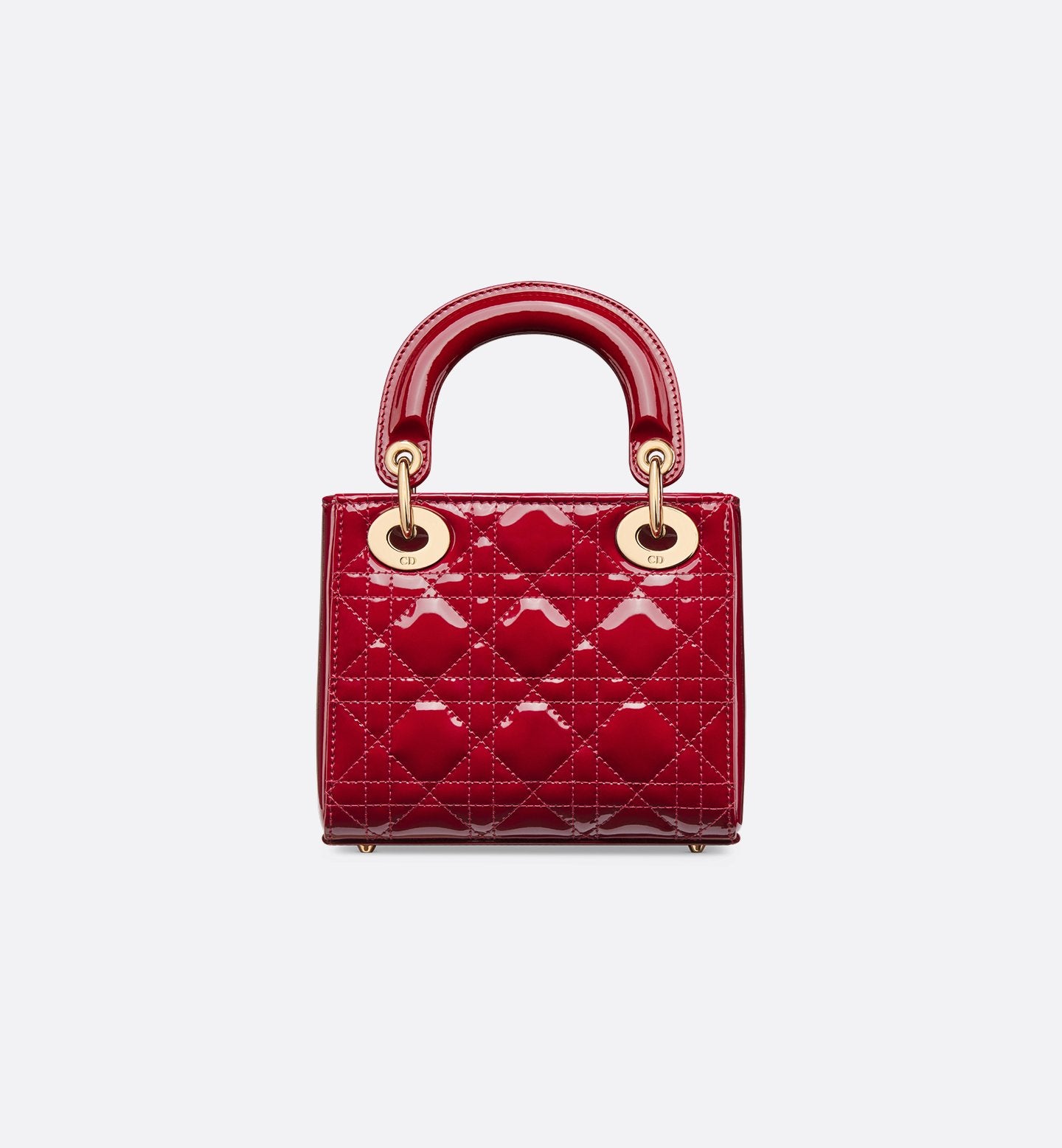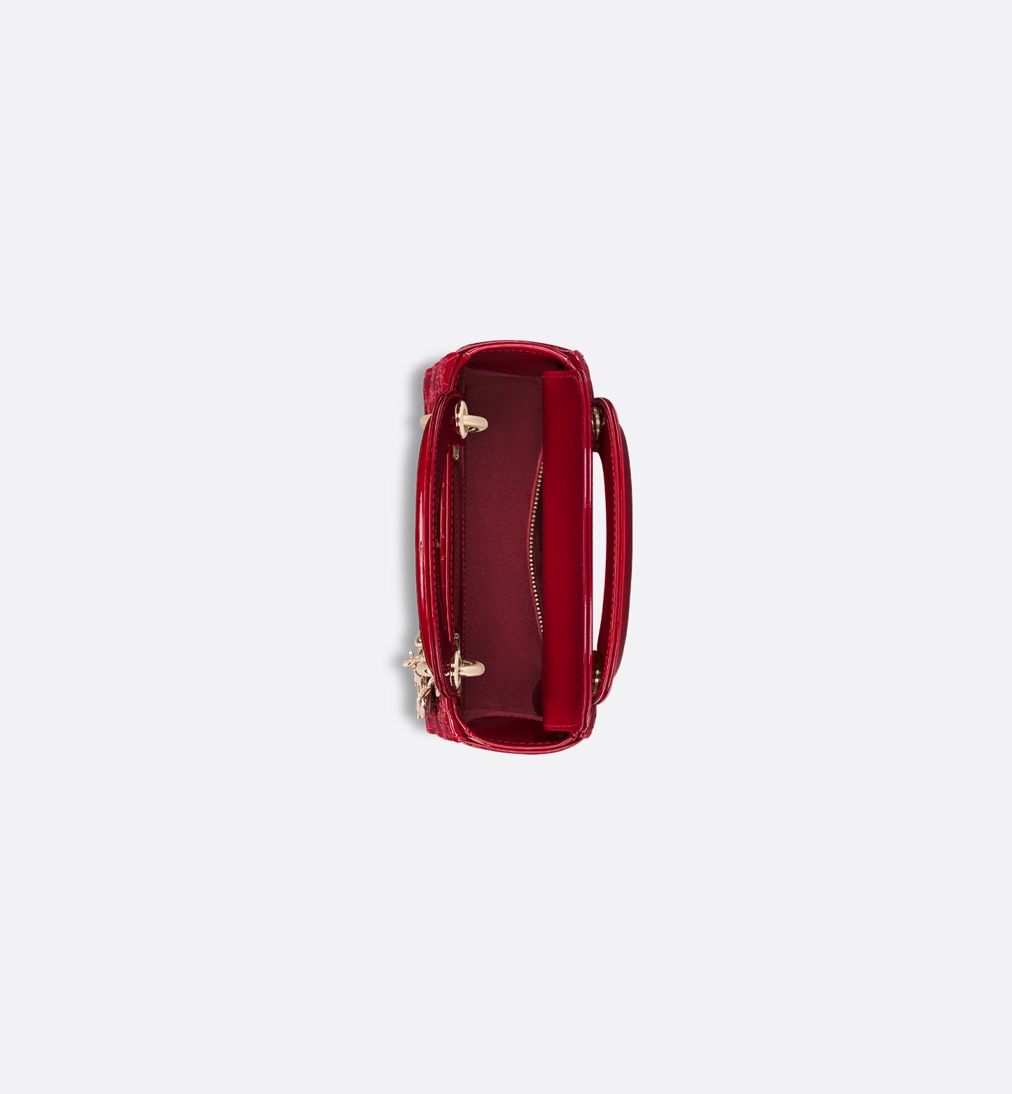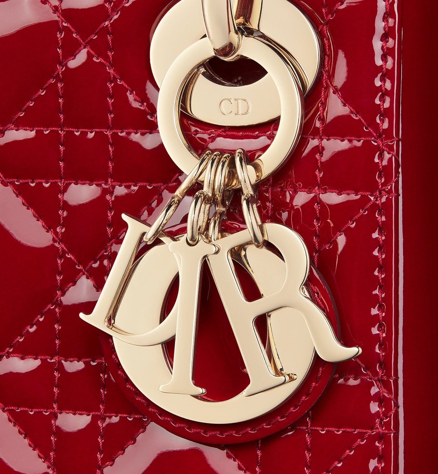 The Lady Dior bag is the epitome of the House's refined style. Elegant and sophisticated, this version strikes with its timeless allure. Crafted from cherry red patent calfskin with Cannage stitching that recreates the legendary and unmistakable quilting motif, it is embellished with DIOR charms in pale gold-finish metal. Featuring a removable chain strap, the mini Lady Dior bag can be carried by hand or crossbody and is perfect for pairing with an evening look.