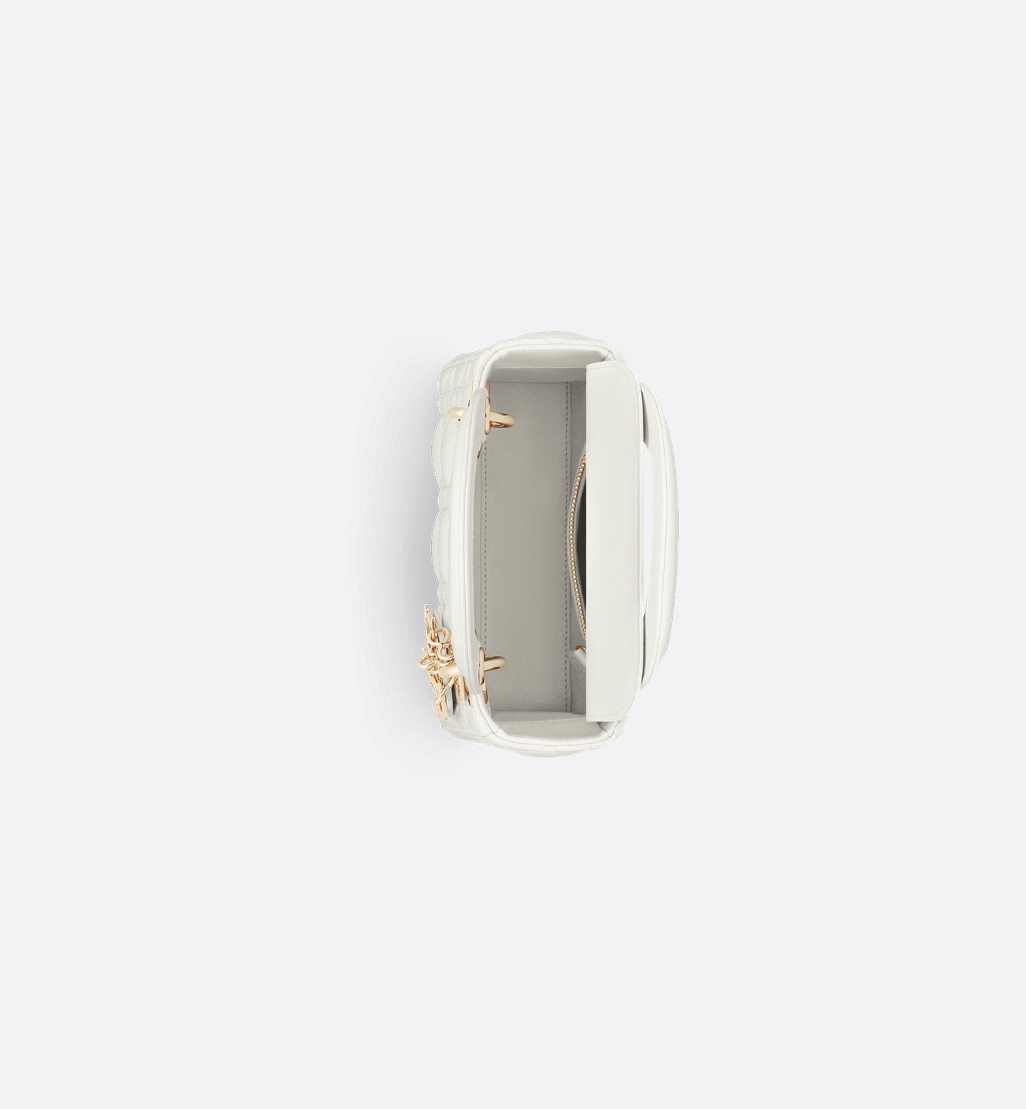 The Lady Dior bag is the epitome of the House's refined style. Elegant and sophisticated, this timeless version is crafted from milky lambskin with Cannage stitching, creating the iconic quilted texture. It is embellished with DIOR charms in pale gold-finish metal. Featuring a mini size and a removable chain strap, it can be carried by hand or crossbody and is perfect for pairing with an evening look.