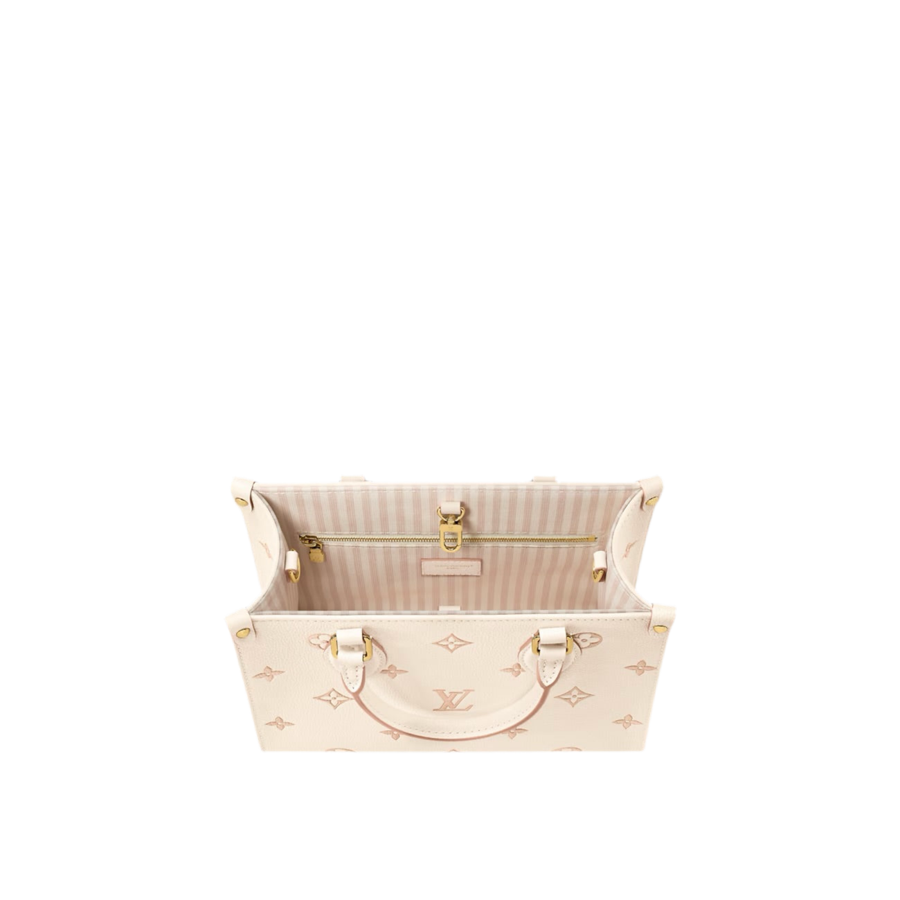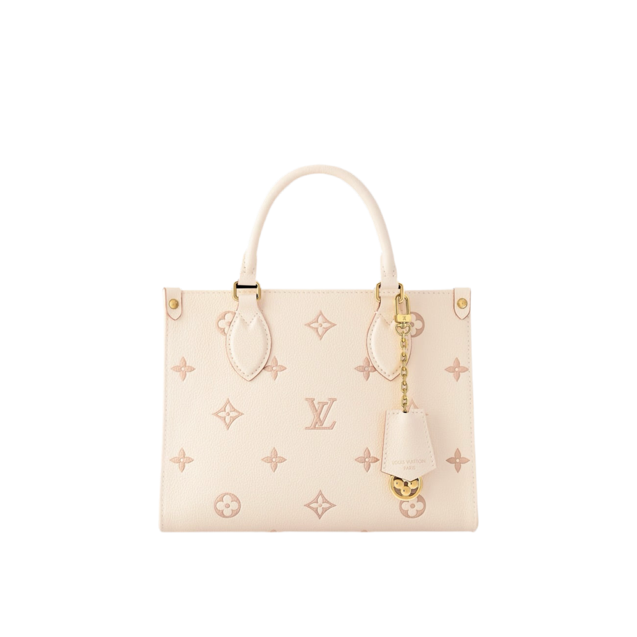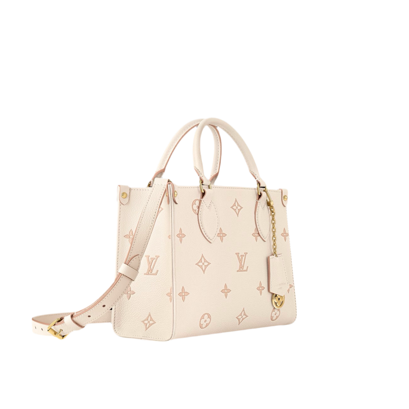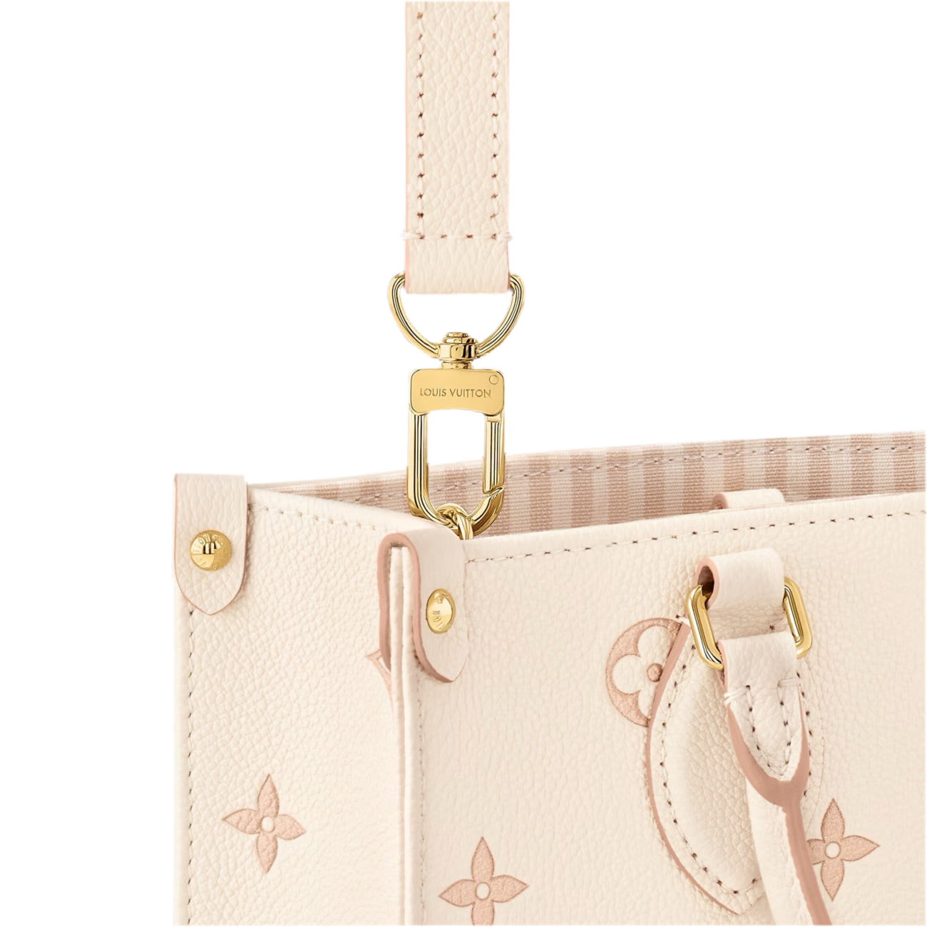 The OnTheGo PM bag, in Monogram Empreinte leather, revisits the classic Maison motif in a refined version with tone-on-tone profiles. The accessory is distinguished by the golden metal parts, such as the removable charm chain, and by the elegant striped fabric lining. The creation, perfect from morning to night, can also be worn on the shoulder or shoulder strap.