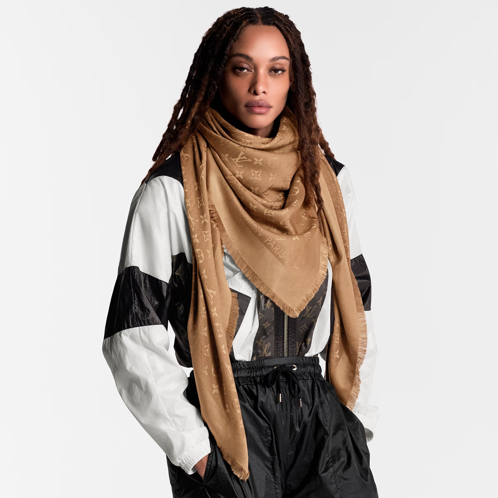 Shawl Monogram" is an update of the travel blanket that first appeared in 1989 with a modern atmosphere. The tone-on-tone fabric is decorated with a monogram pattern using jacquard weaving techniques, adding a casual sparkle. High-quality silk and wool blend material creates an elegant drape.