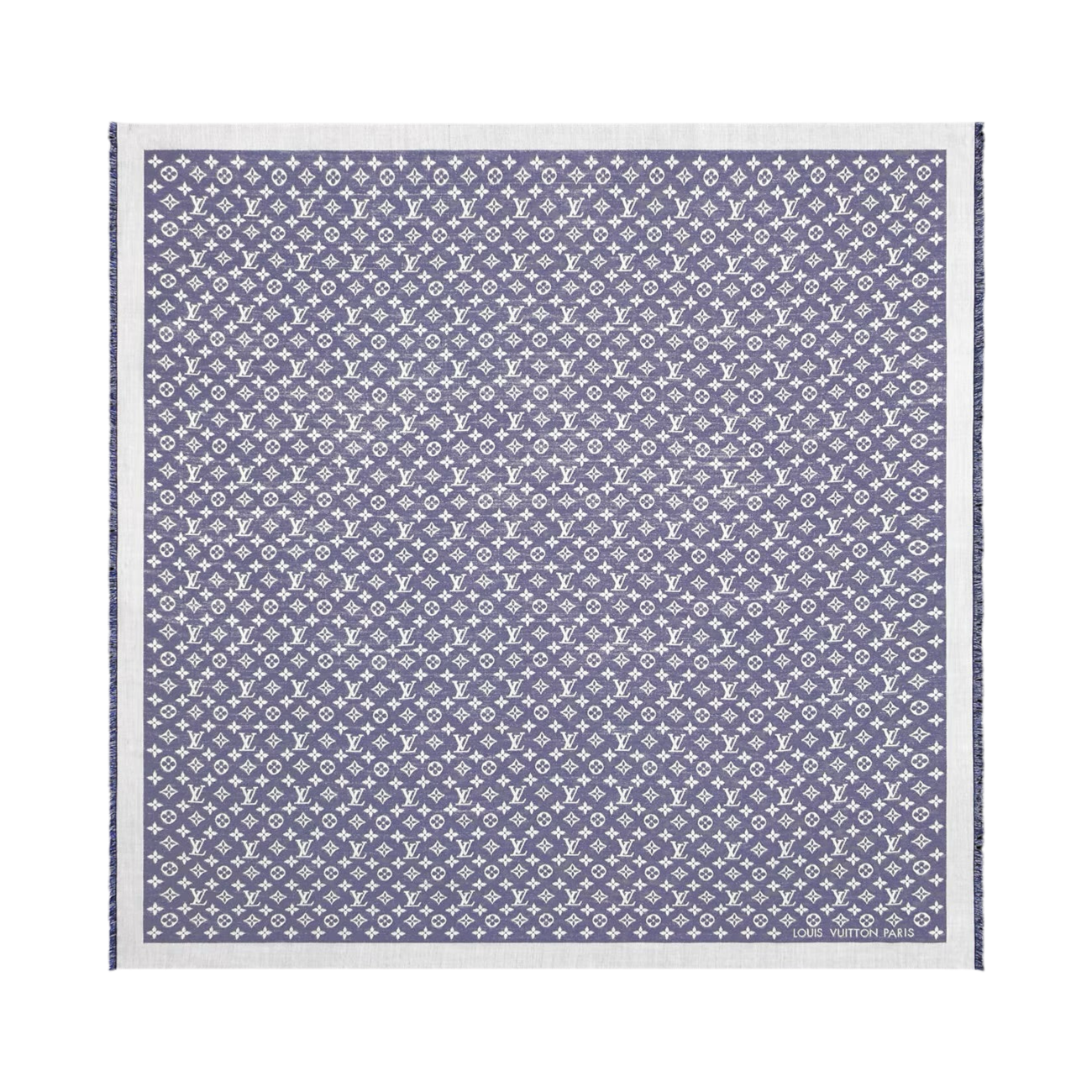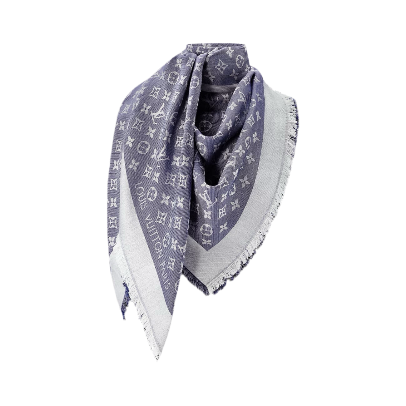 Shawl Monogram Denim" with a luxurious and soft feel is perfect for daily use. It is a feminine item decorated with an iconic monogram pattern and a "Louis Vuitton" signature with a jacquard weaving technique. It is a design finished with a fringe on a soft silk & wool blend material.